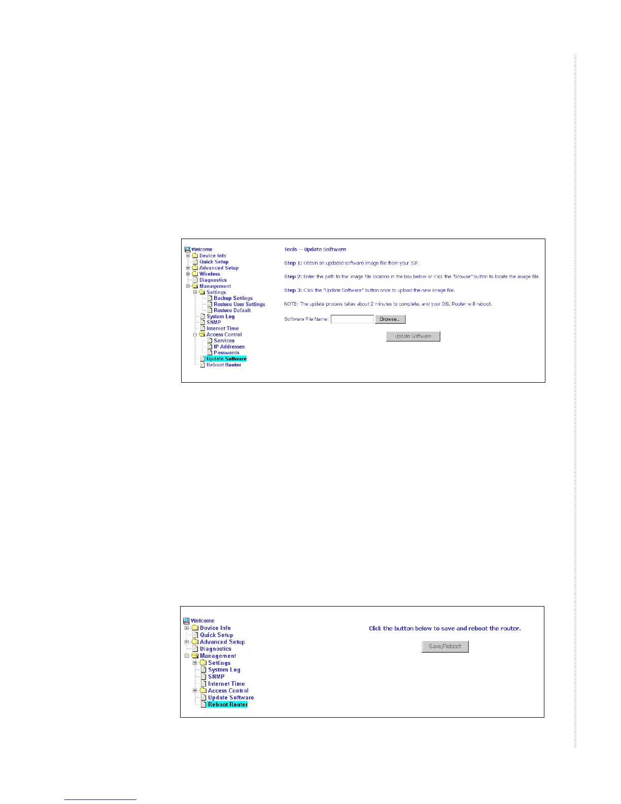 Select Management -> Reboot Router to reboot the router using the web
