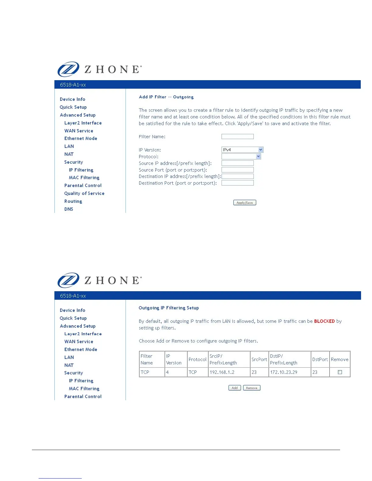 When you Save / Apply the IP filter, the Outgoing IP Filtering Setup screen appears. The