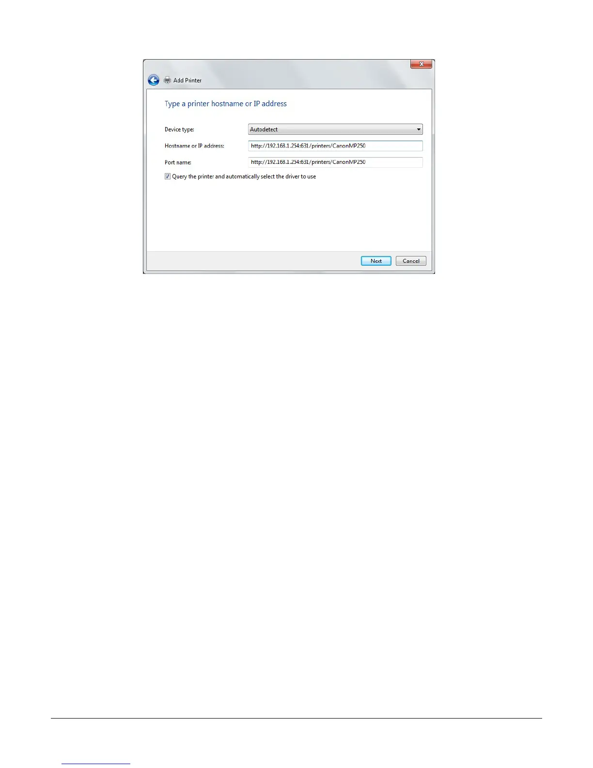 For example: http://192.168.1.254:631/printers/CanonMP250 and click Next.