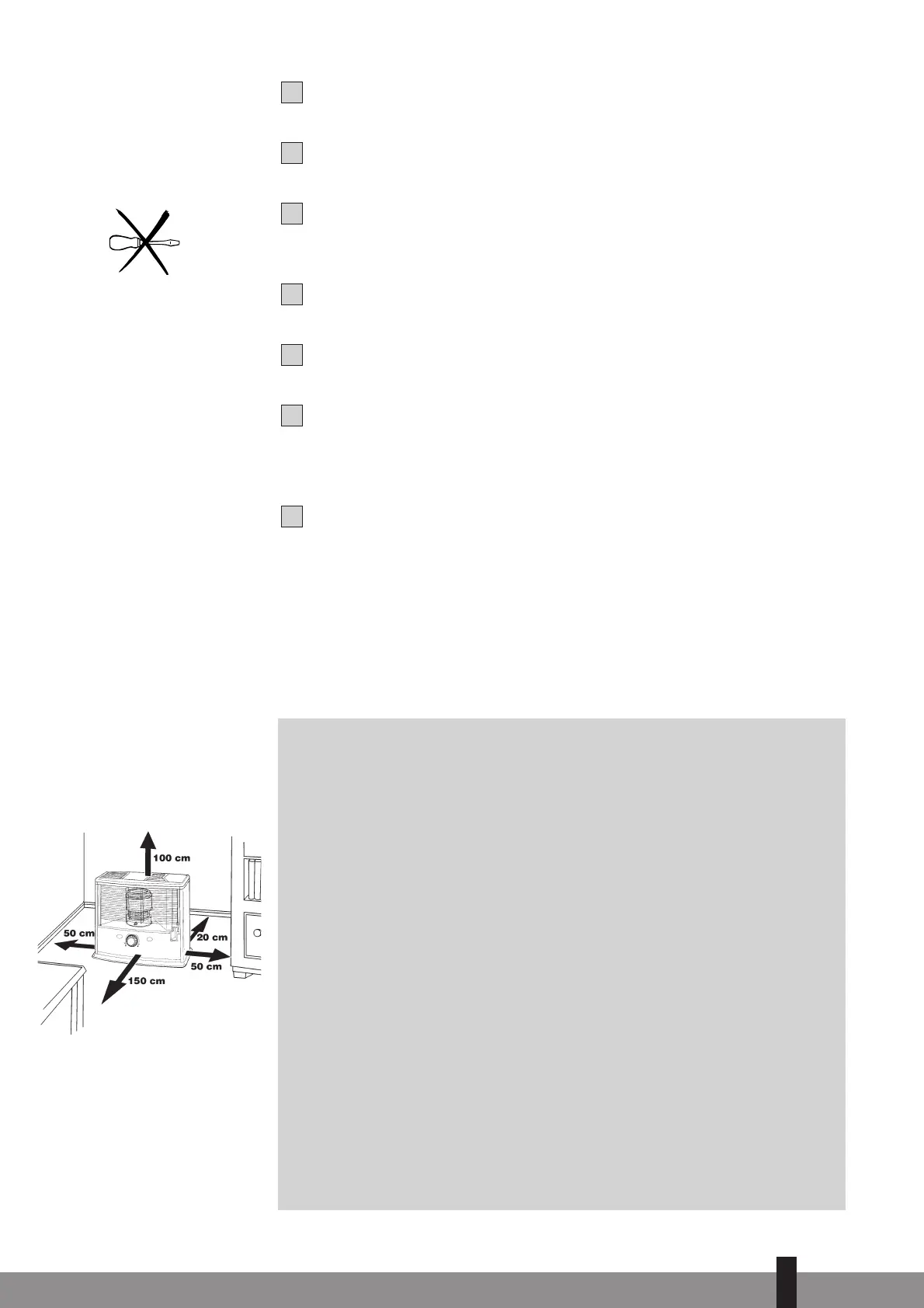 8 N'utilisez jamais le convecteur dans des endroits où des gaz, solvants ou