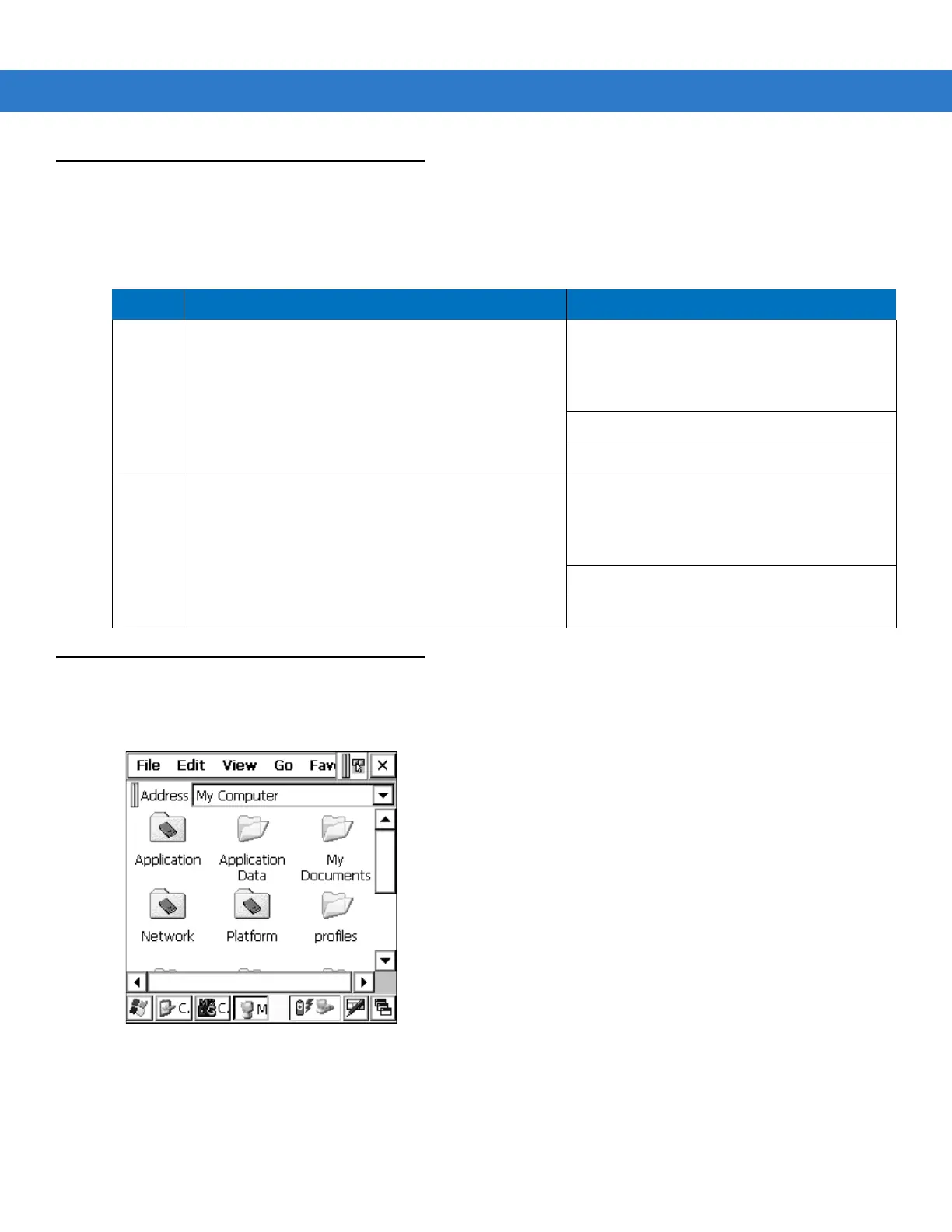 The mobile computer directory structure displays all of the file folders, see Figure 2-10. The pre-installed folders