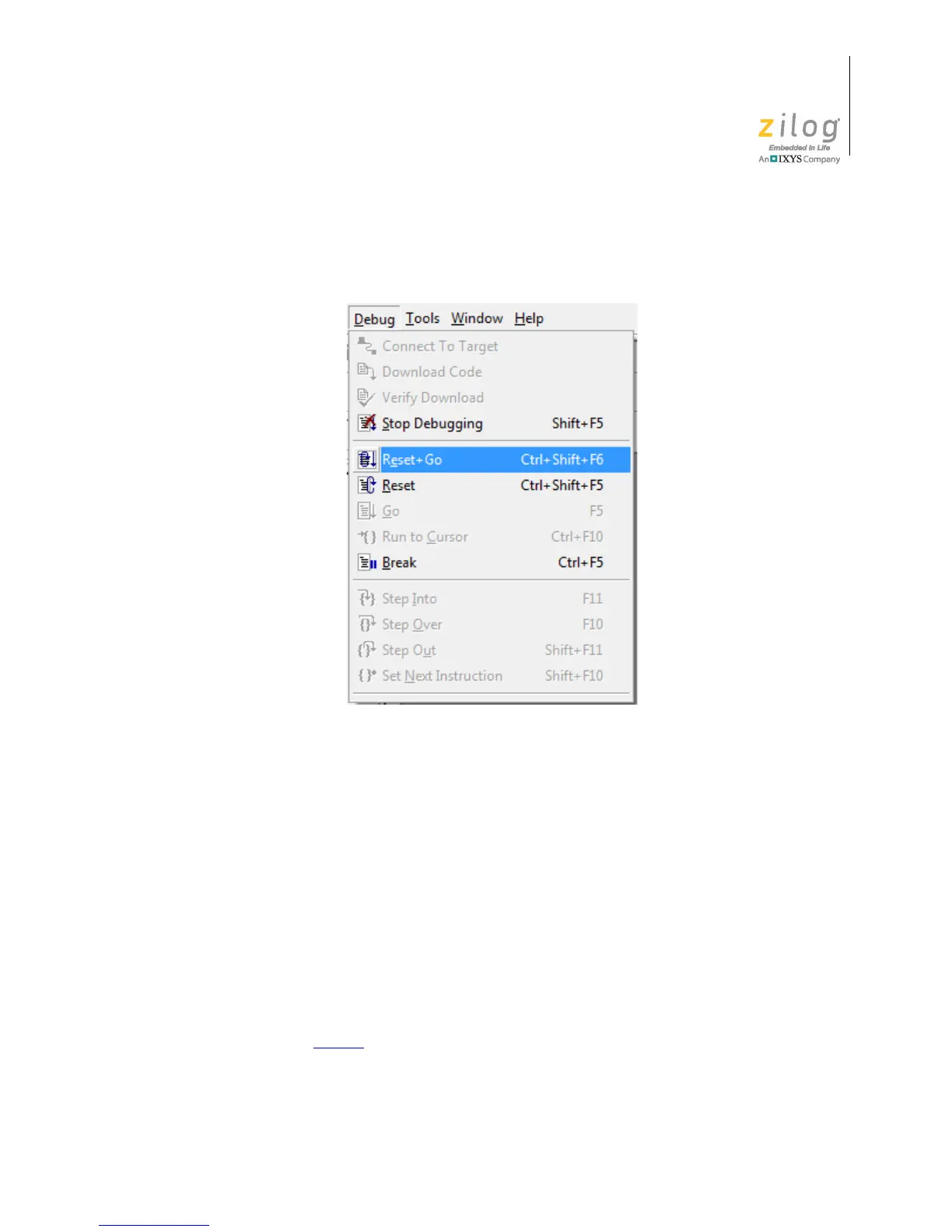 13. To run the application, select Reset+Go from the Debug menu, as indicated in