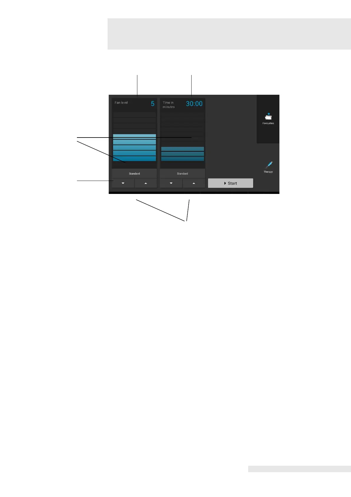 By tapping the arrow button, the fan level and therapy time values decrease or