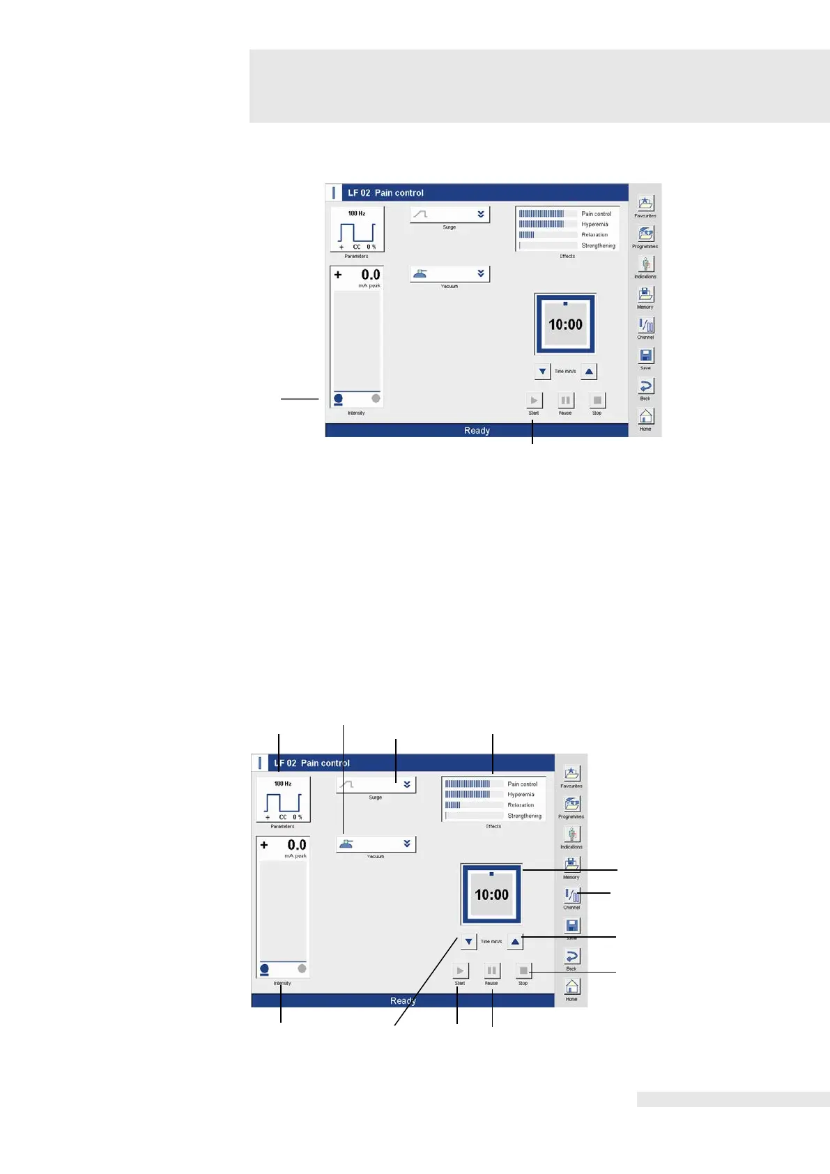 After selecting the current form, the therapy screen automatically opens on channel I.