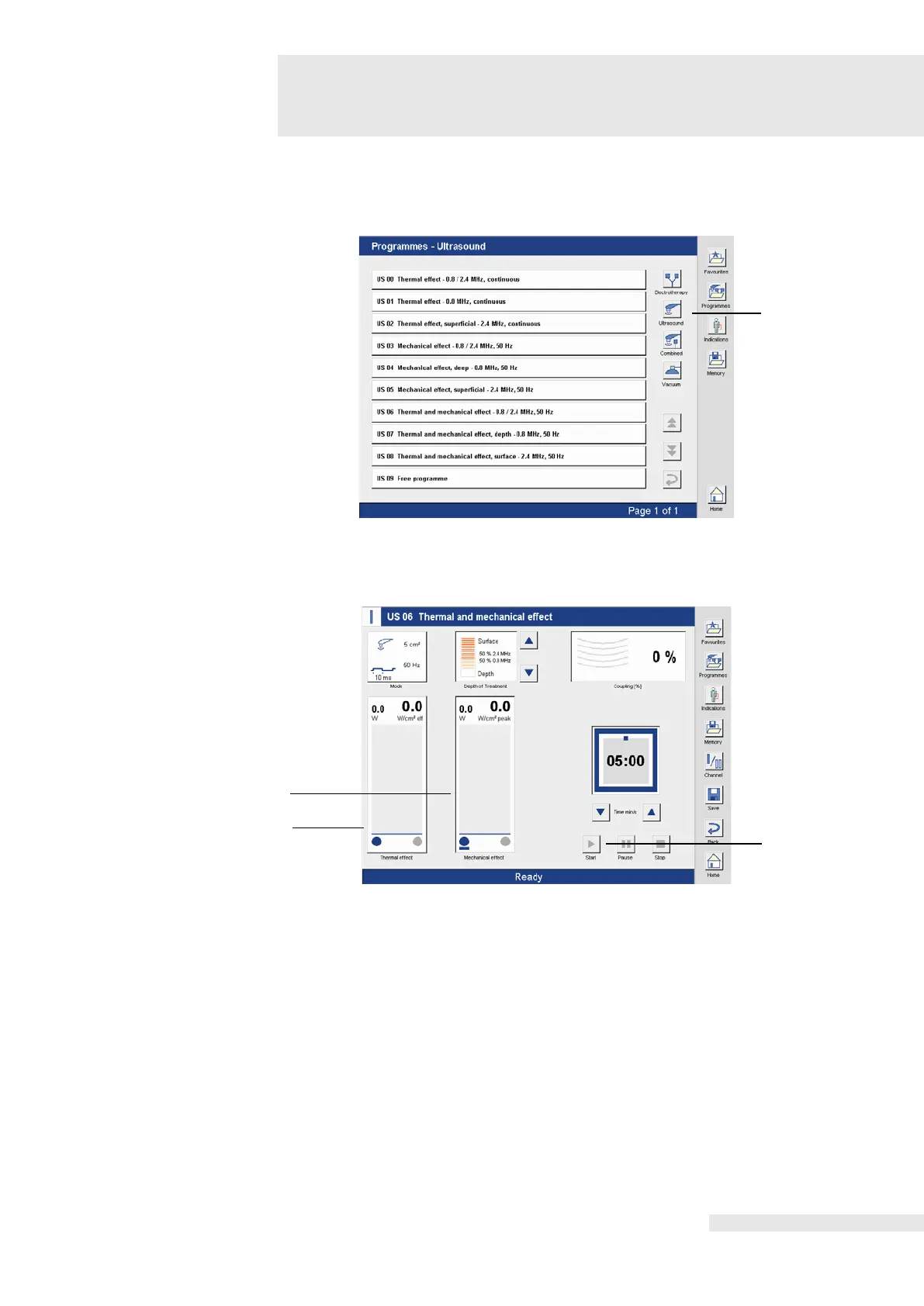 The desired ultrasound therapy program is selected directly in the corresponding line.