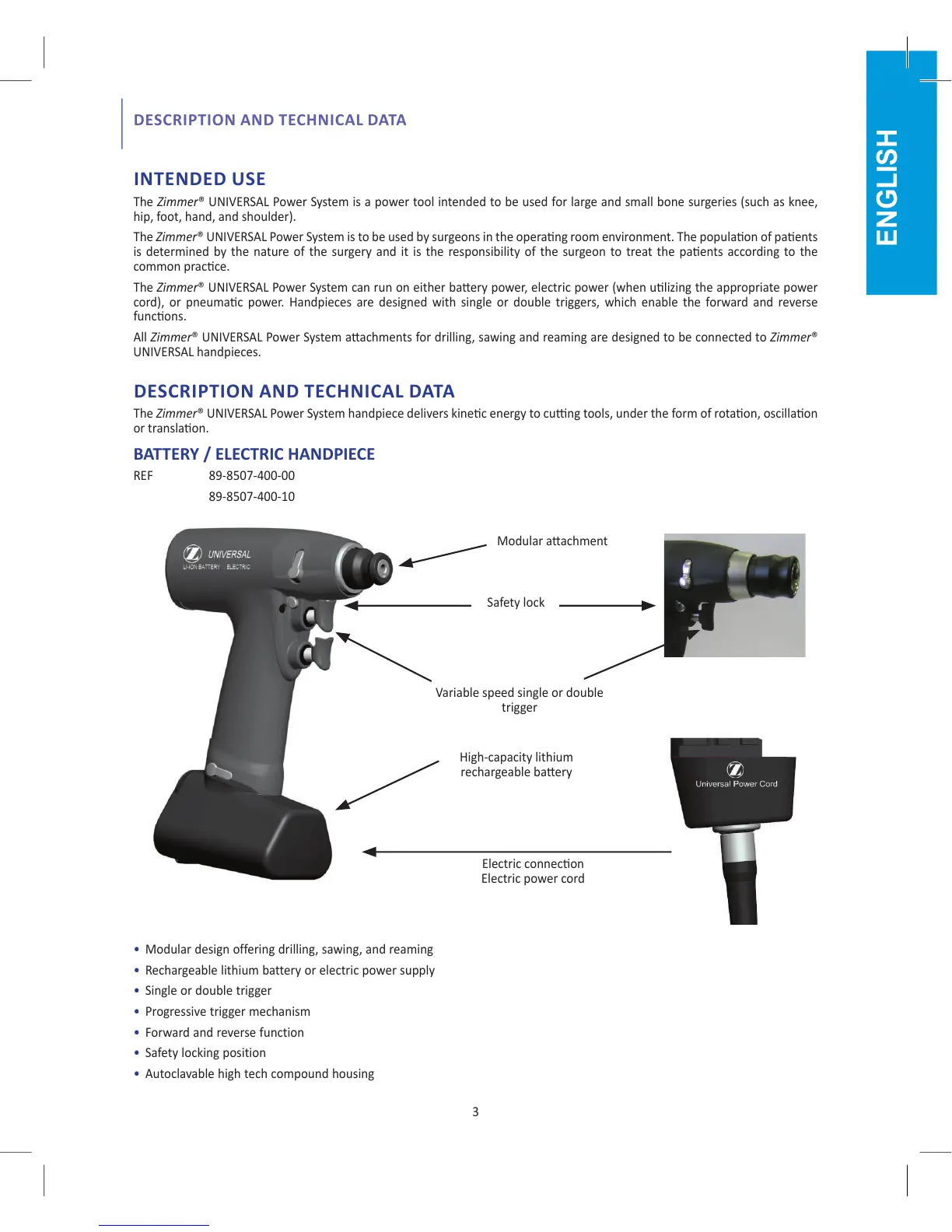 The Zimmer® UNIVERSAL Power System is to be used by surgeons in the operang room environment. The populaon of paents