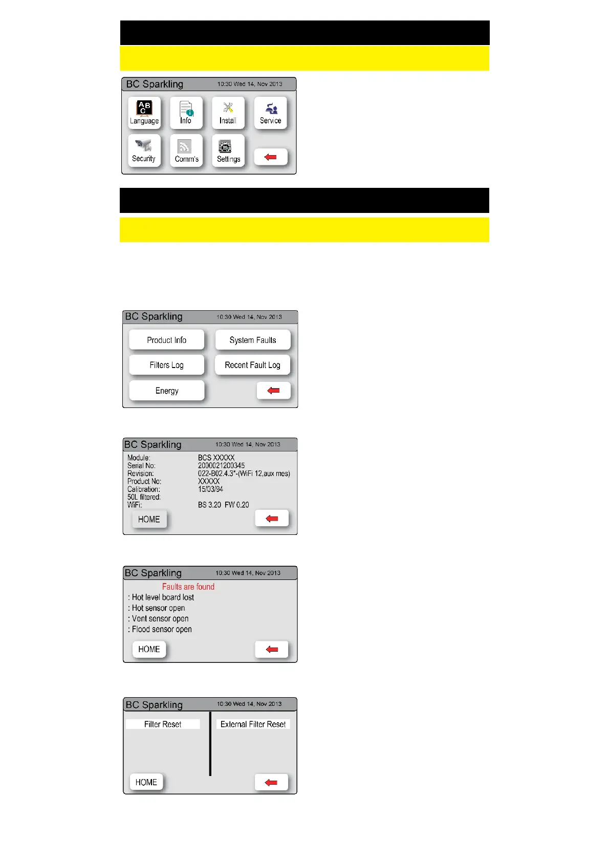 In this section, you can find product information, system faults and check the