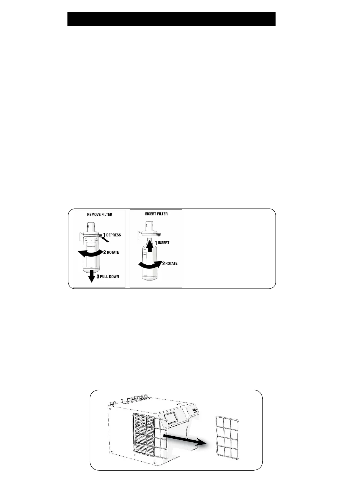 shown in the “insert filter” diagram for filter cartridge replacement), and