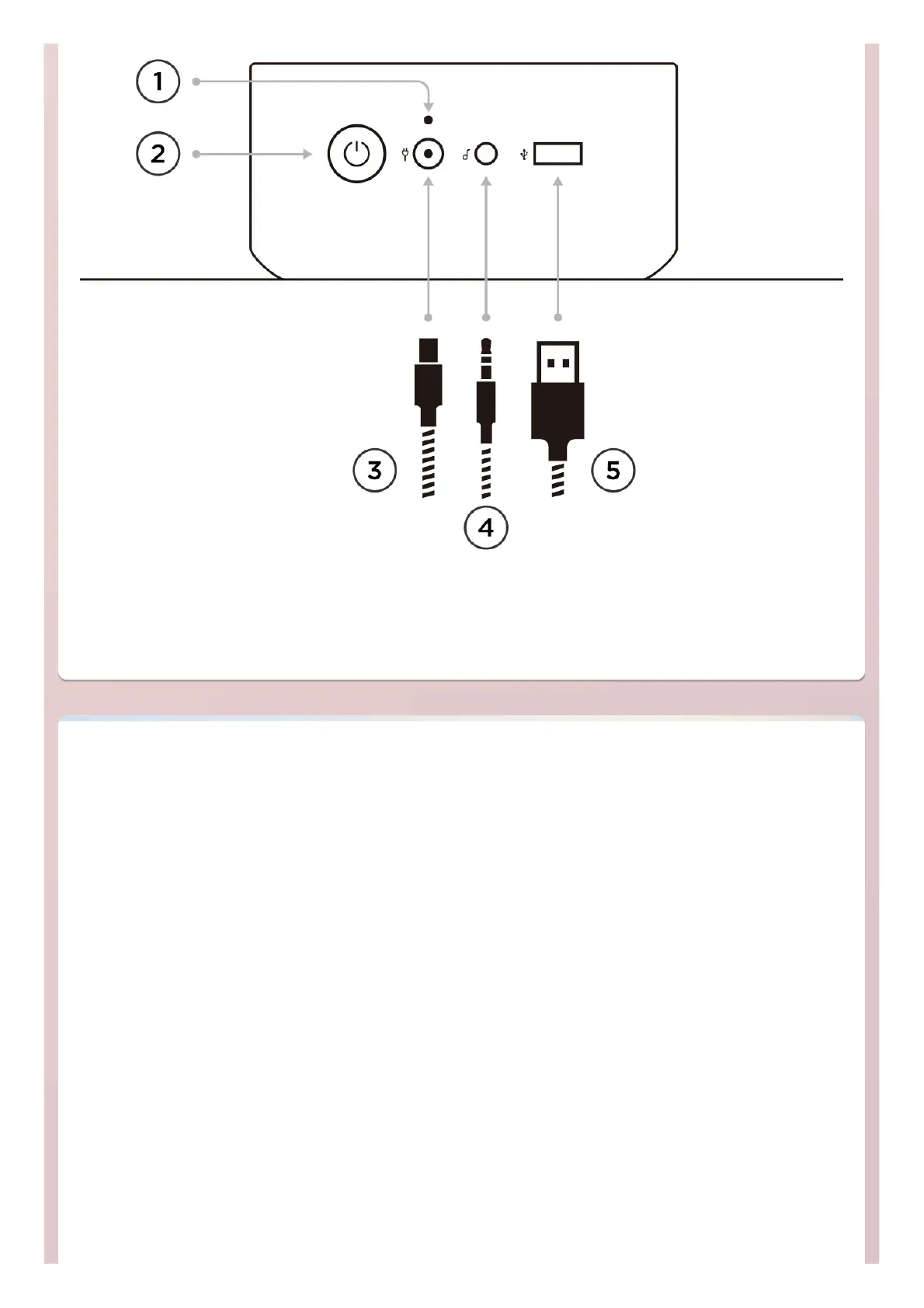 ① Charging Indicator Light ② Power Button ③ Power Cord ④ 3.5mm audio cable ⑤ USB cable