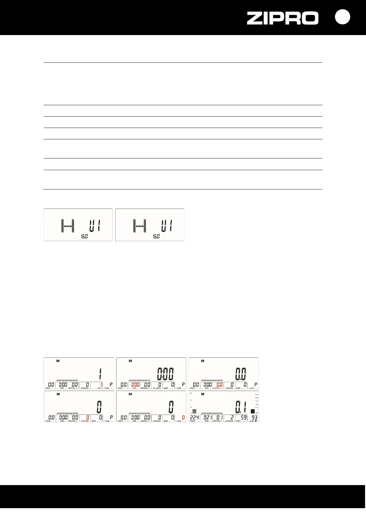 Pořadí změn: M (manuální) →P (tréninkový plán 1-12) → ♥ (H.R.C) → W (řízený tréninkový plán Watt) → U