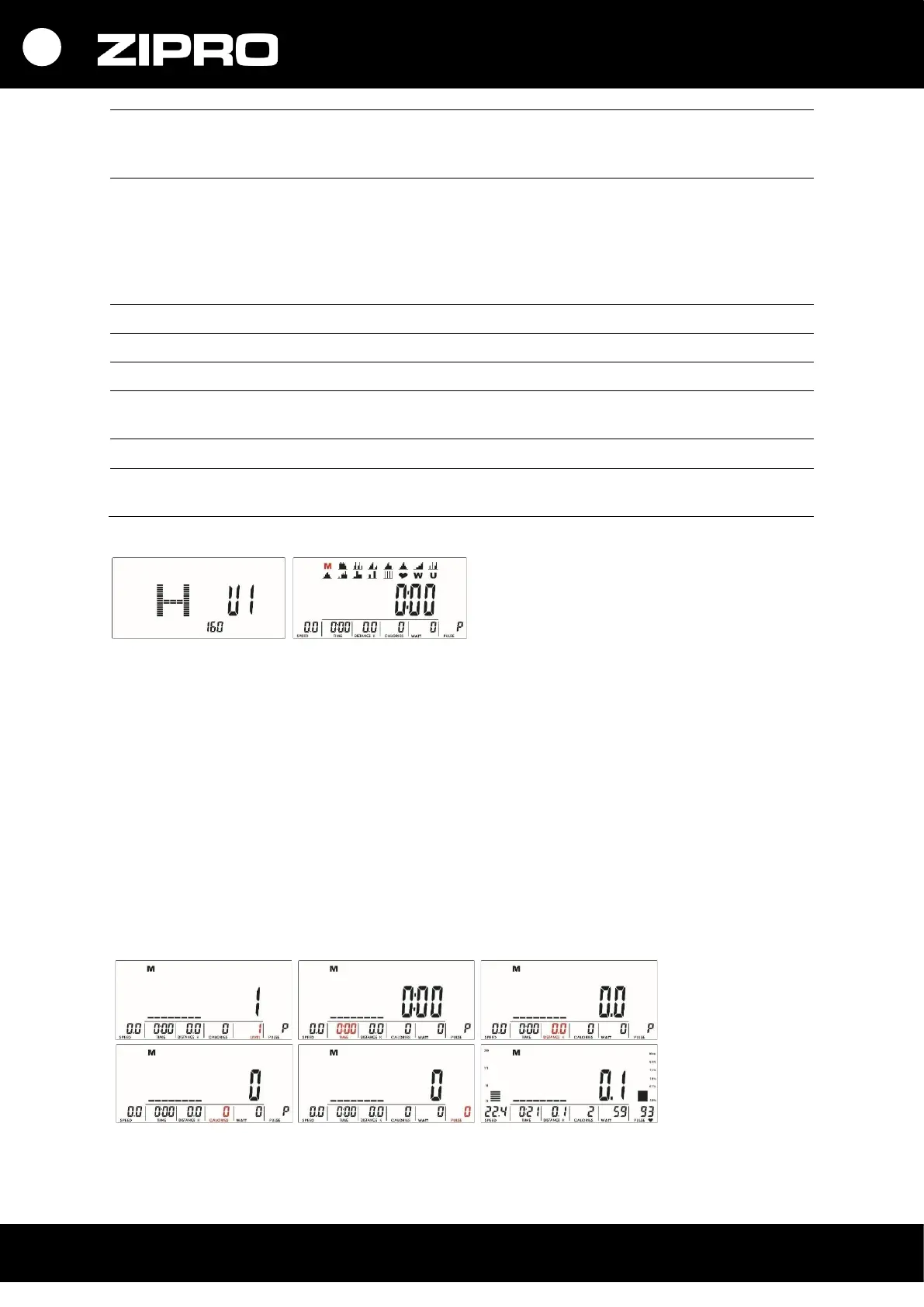 Kolejność zmian: M (Manual) →P (Program 1-12) → ♥ (H.R.C) → W (WATTS) → U (User).