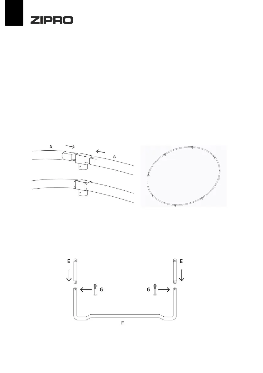 Connect upper rails (A) using T bars to make a ring. This must be done by two people.