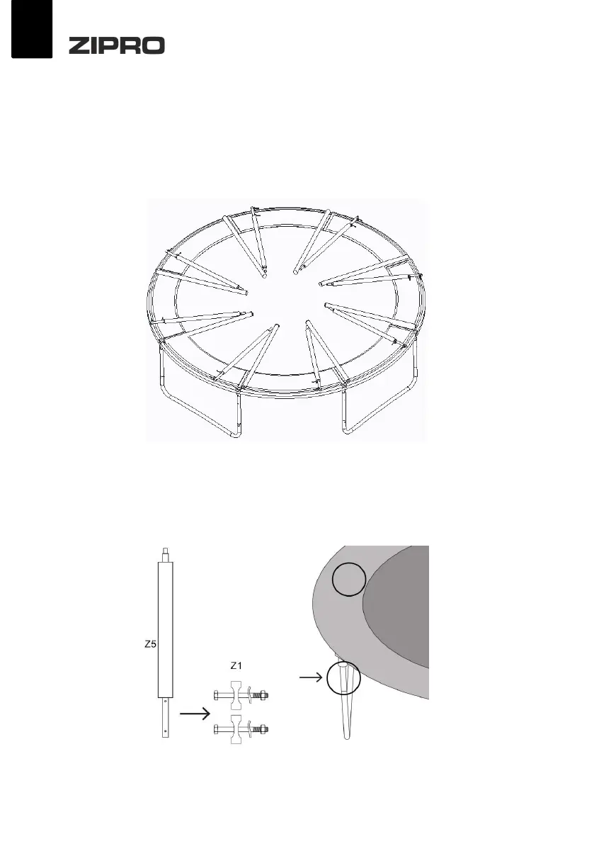 Pfostenteile (Z5) an die Trampolinfüße an. Zwischen den Pfosten und den Füßen