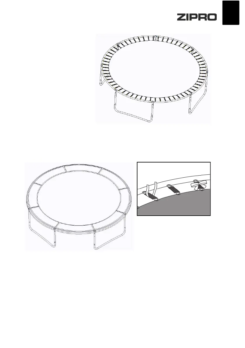 Наложить кожух пружин (В) на раму батута. Привязать ее снизу к пружинам