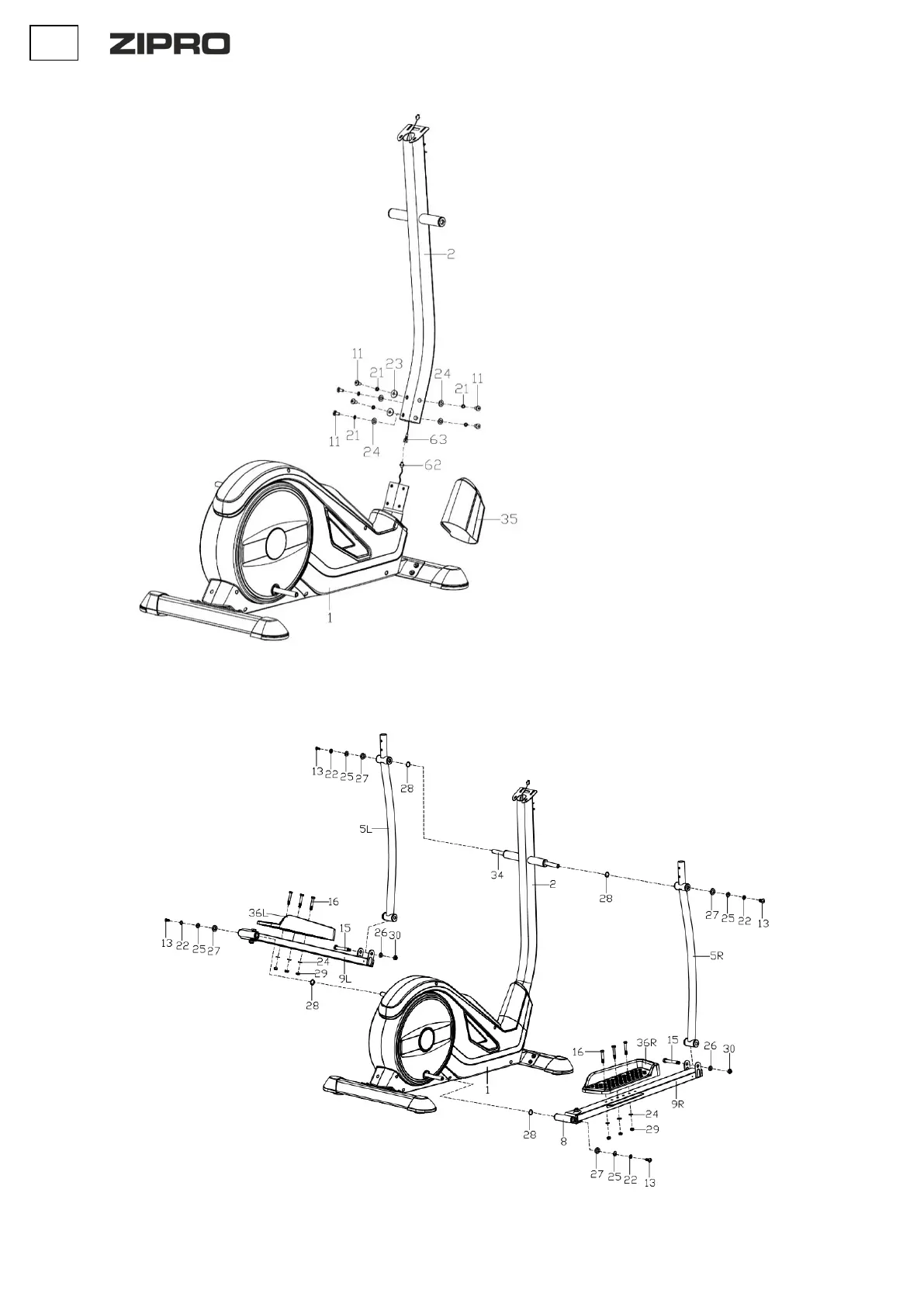 a. Glisați axul lung (34) pe orizontală în locul corespunzător pe stâlpul de direcție (2). Montați brațele stânga și dreapta ale ghidonului (5L/R) pe axul