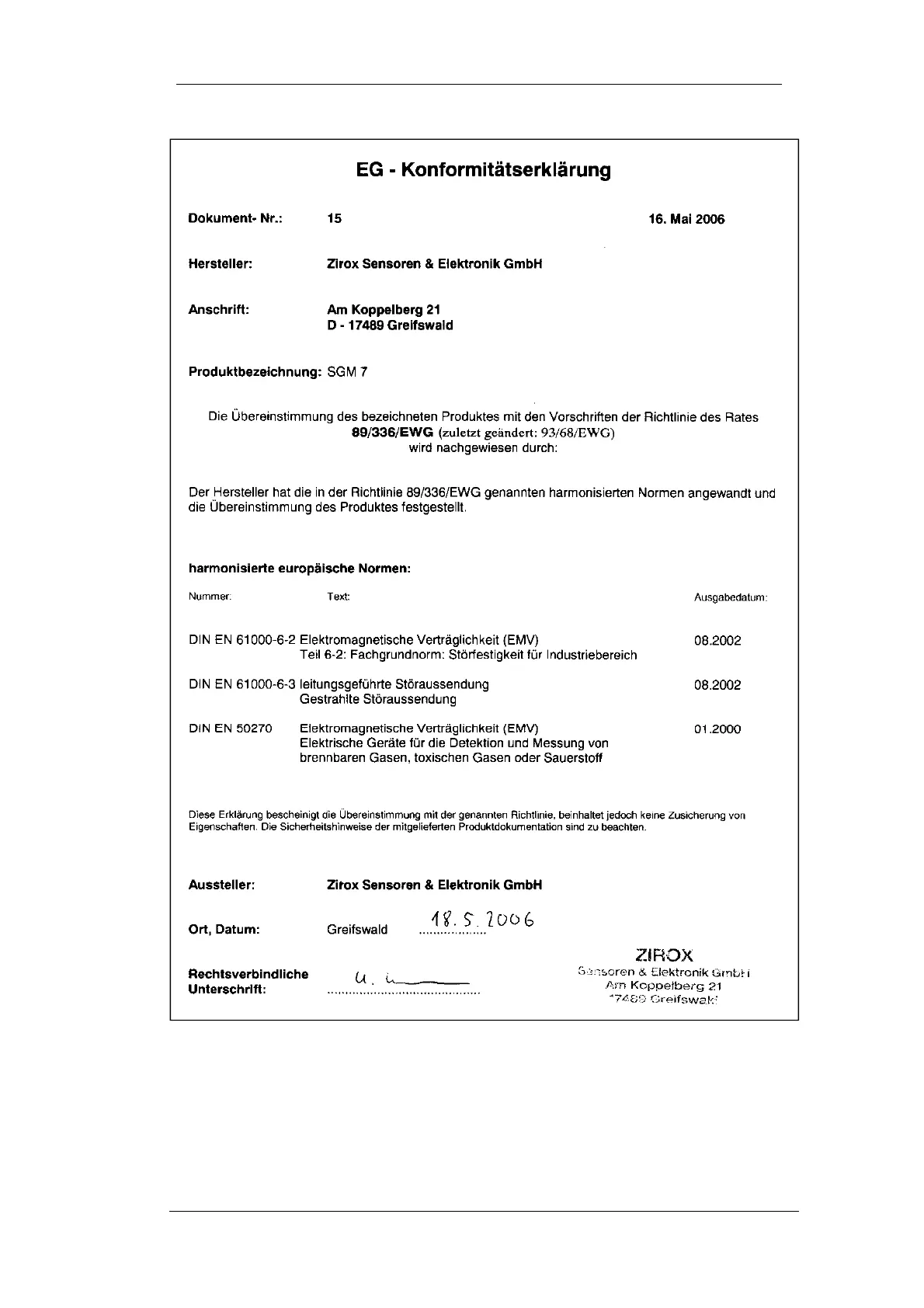 ZIROX SGM7 - 10 Appendix (cont.); 10.5 EU Declaration of Conformity
