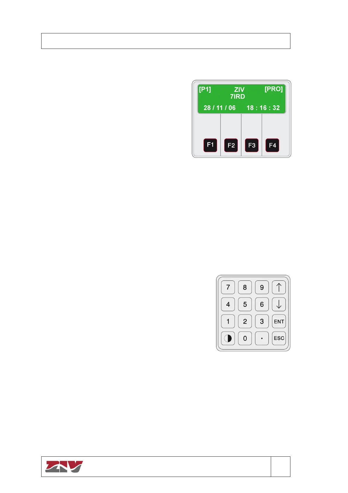 The keypad shows the IED model, date and time. It also shows, on the first row left, the