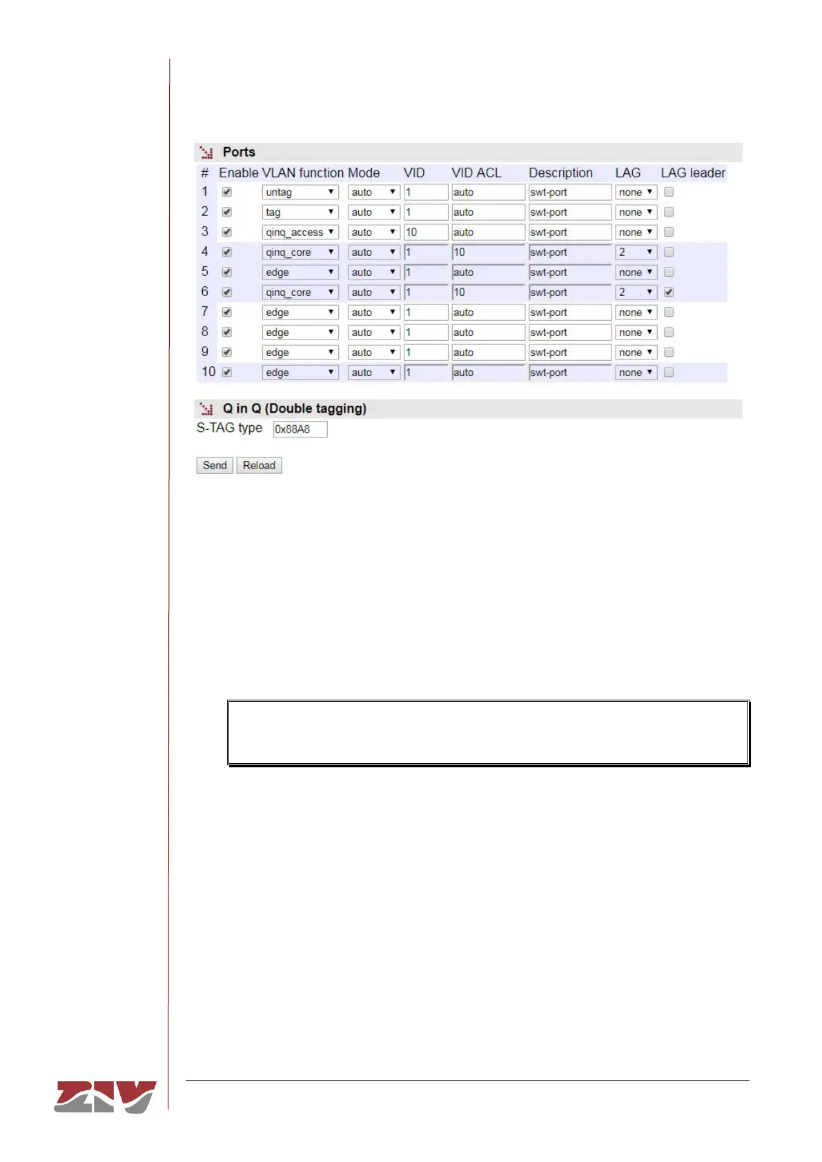 • VLAN function. It specifies the port behaviour when processing the tag 802.1q,