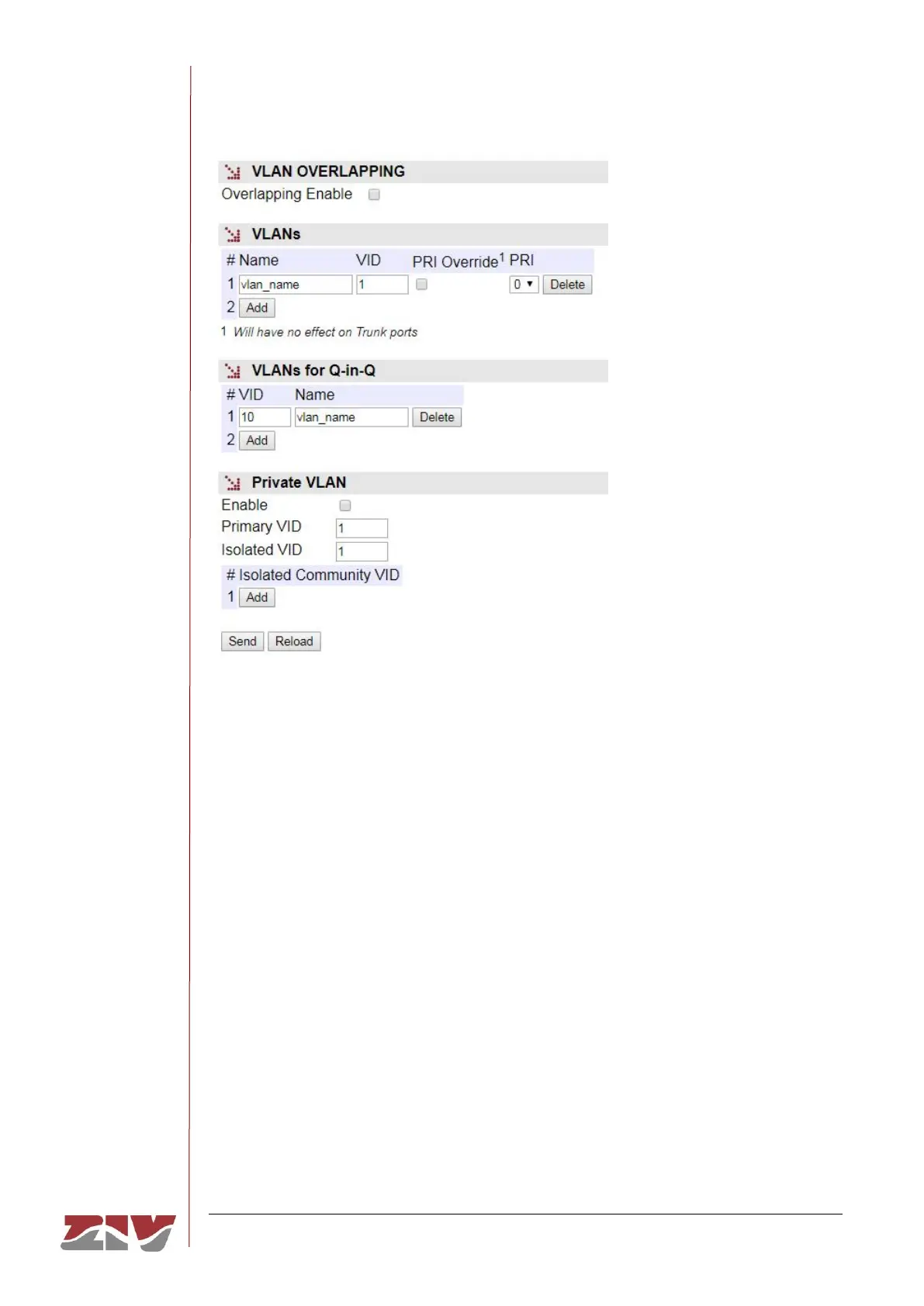 The screen associated to the VLANs menu has four distinct sections, which are described