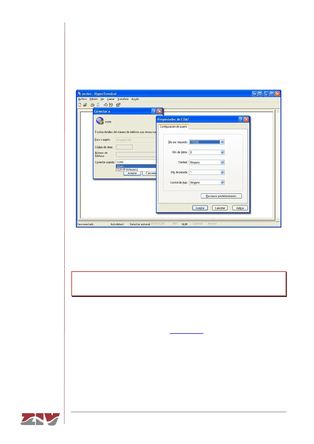 FIGURE 60 Connection configuration through the serial port with HyperTerminal