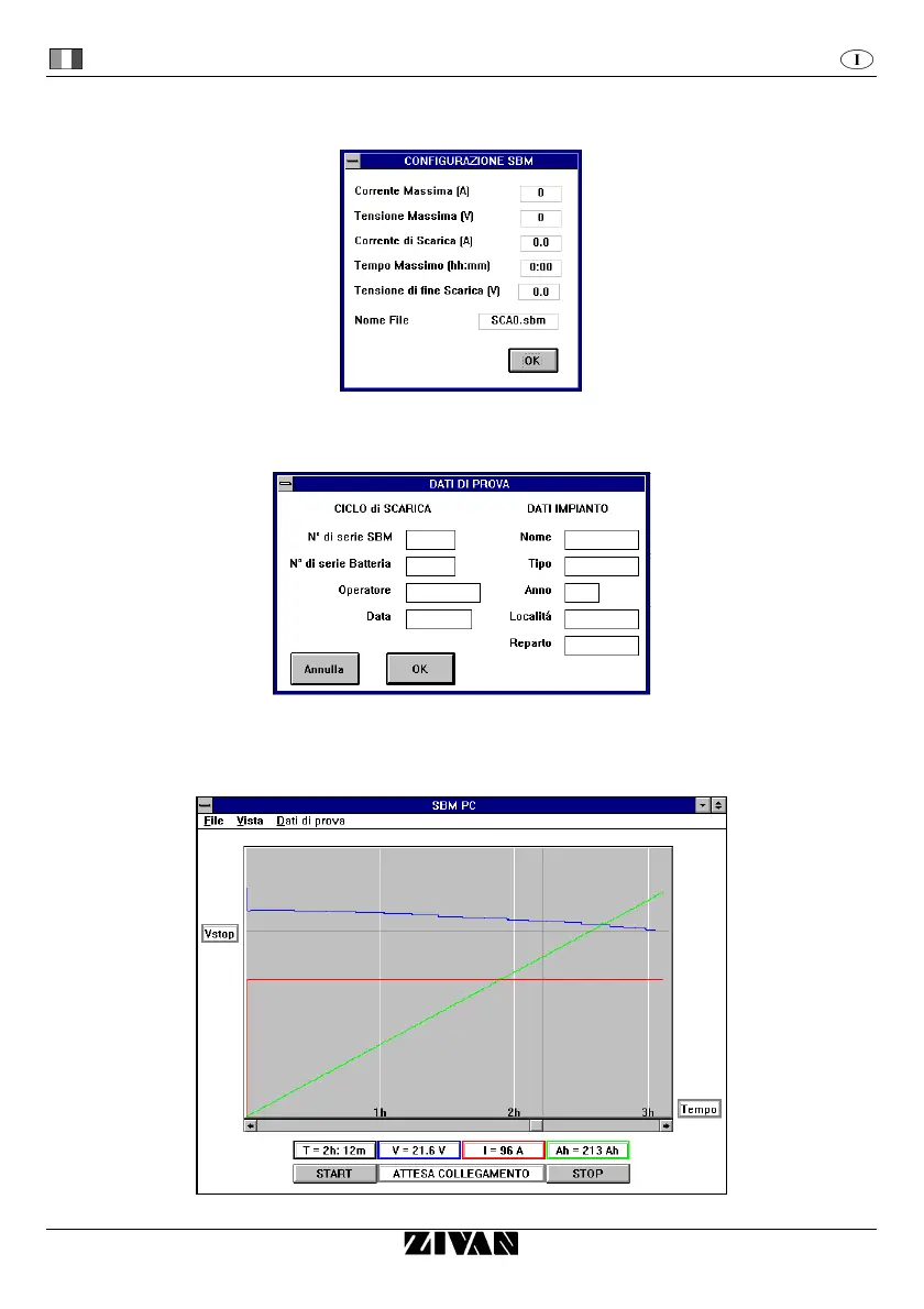 Il grafico visualizza gli andamenti di tensione (colore blu), corrente (colore rosso) e amperora (colore