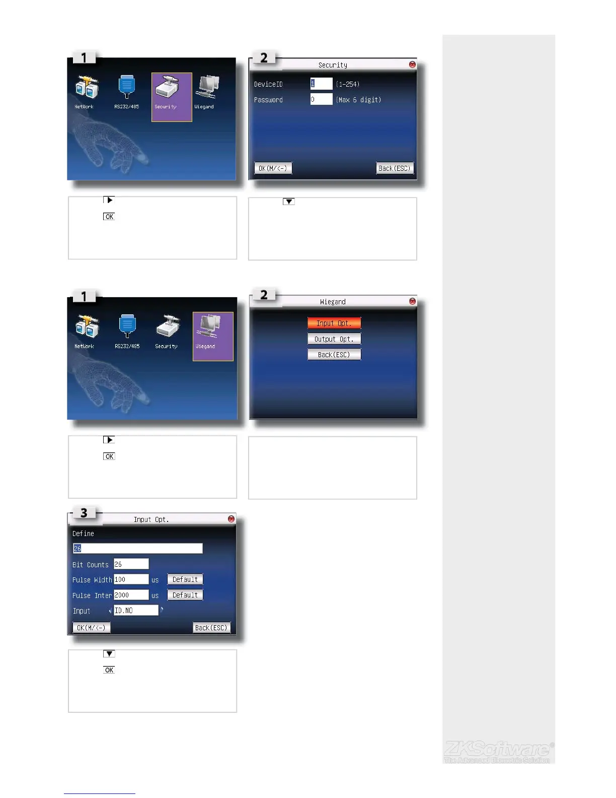 Zksoftware IN01 - Security and Wiegand Settings; Device Security and Password Management; Wiegand Communication Configuration