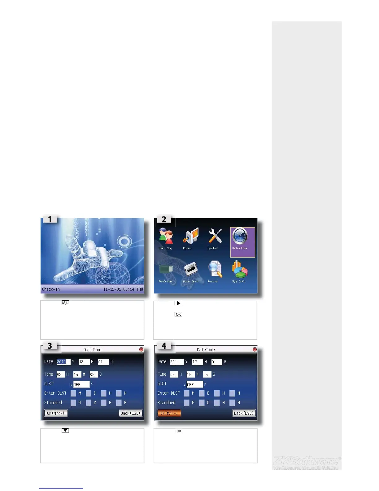 Follow the steps shown to access the Date/Time adjustment menu: