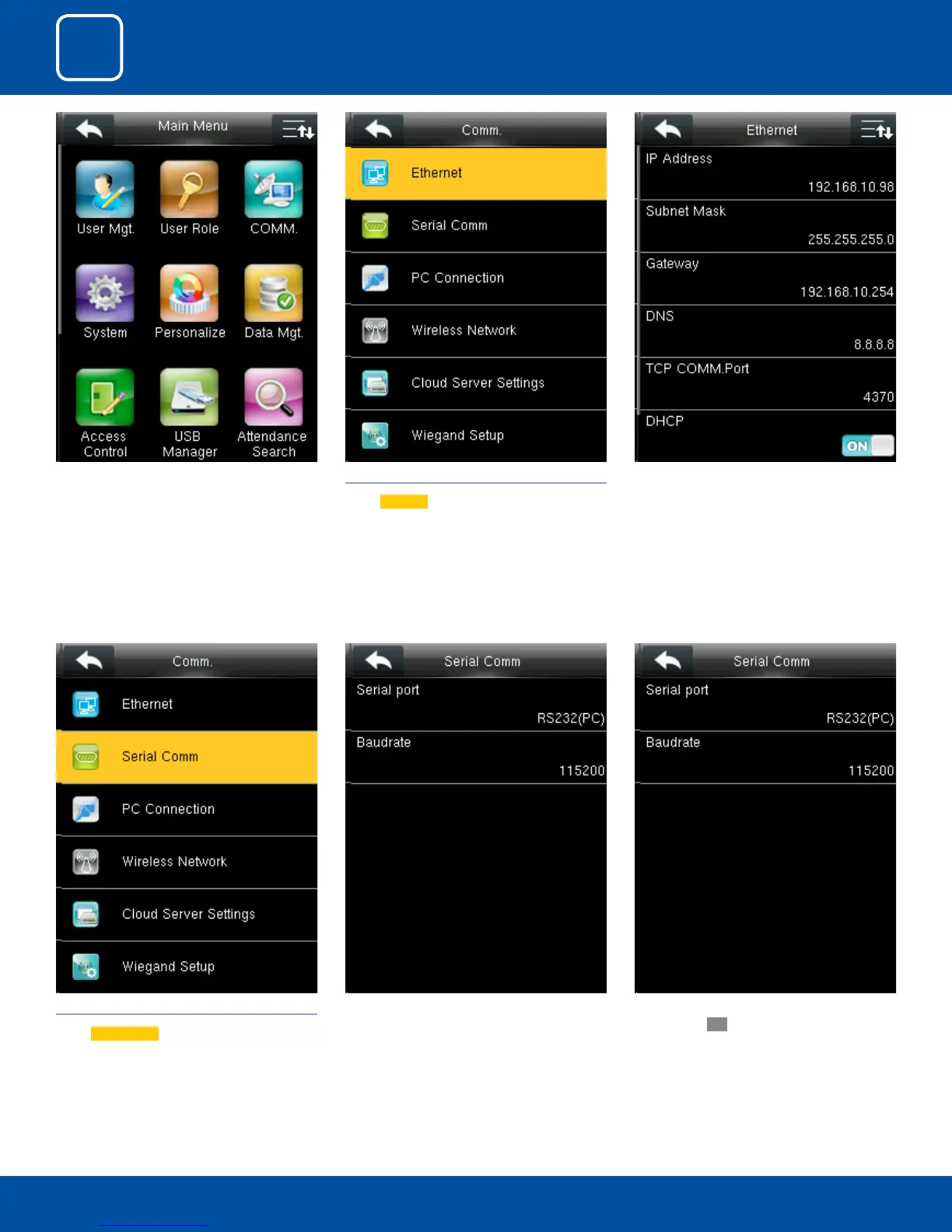 ZKTeco F305 - Ethernet Configuration; Serial Communication Setup