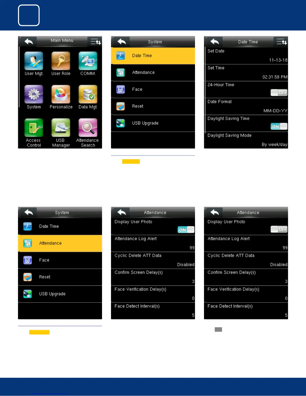 ZKTeco F305 - Date and Time Settings; Attendance Settings