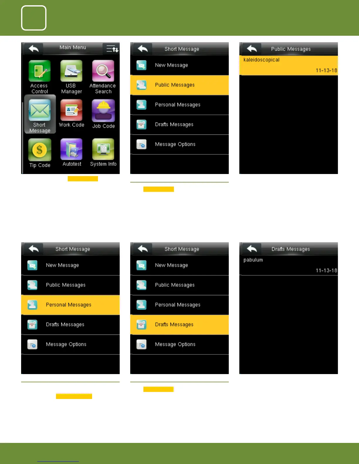 ZKTeco F305 - Public Messages; Personal Messages; Draft Messages