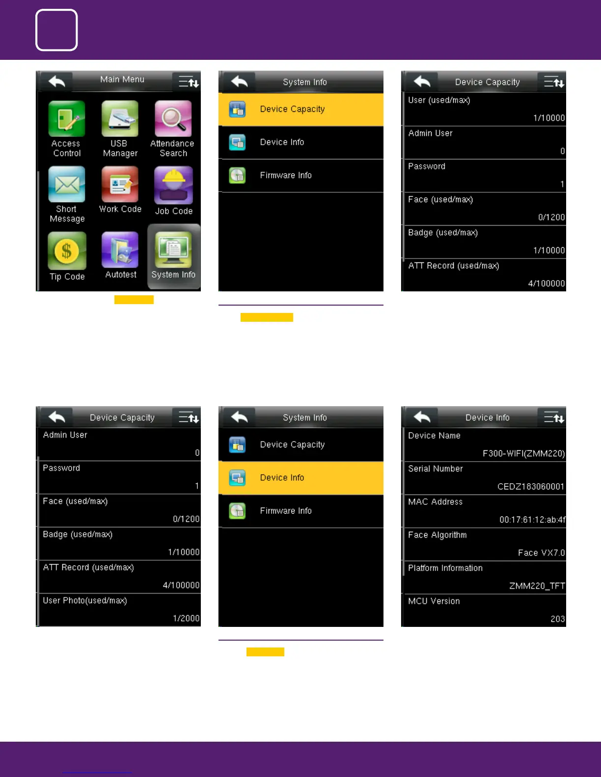 Go to menu and select System Info . 15.1 DEVICE CAPACITY