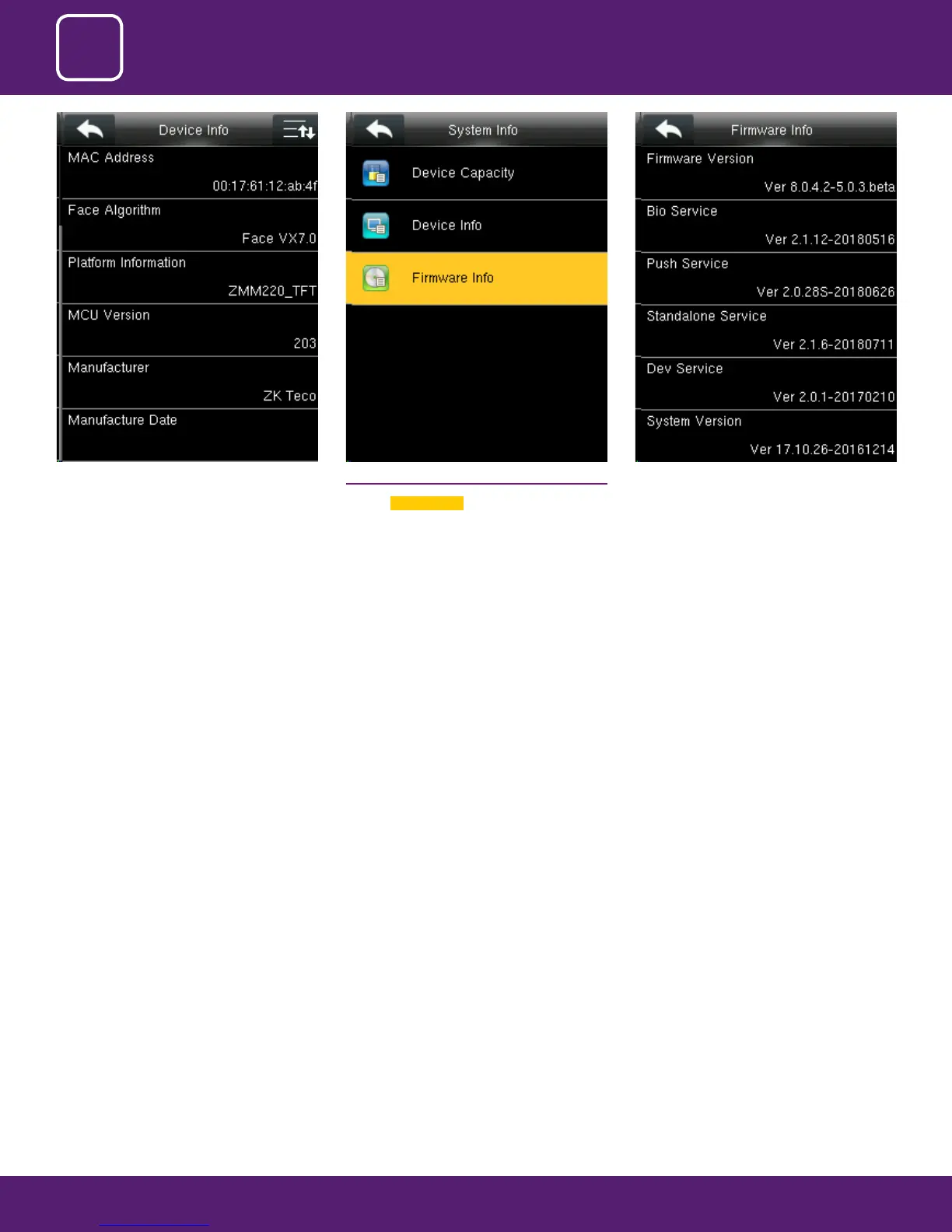 The Firmware version, Bio Service, Push Service,