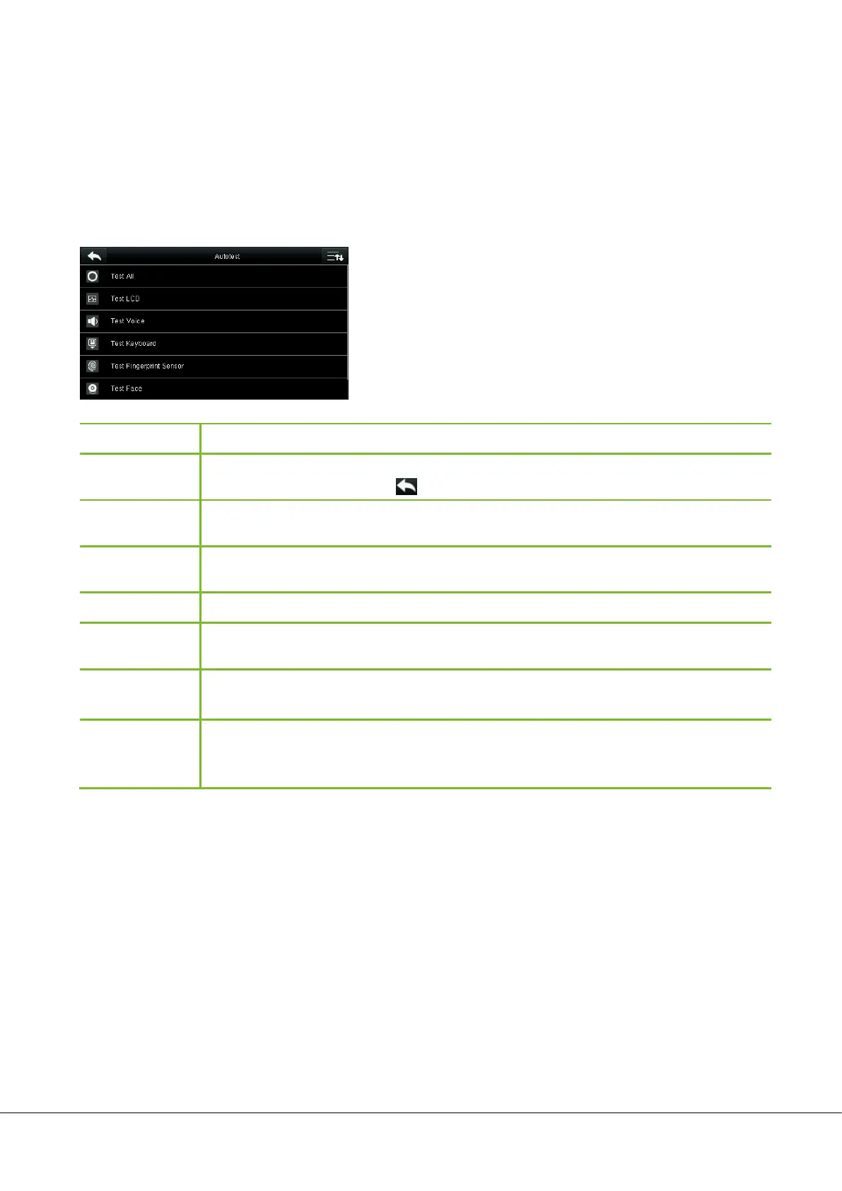 To test LCD, Voice, Keyboard, Fingerprint Sensor, Face, and Clock RTC. During the test, Touch the