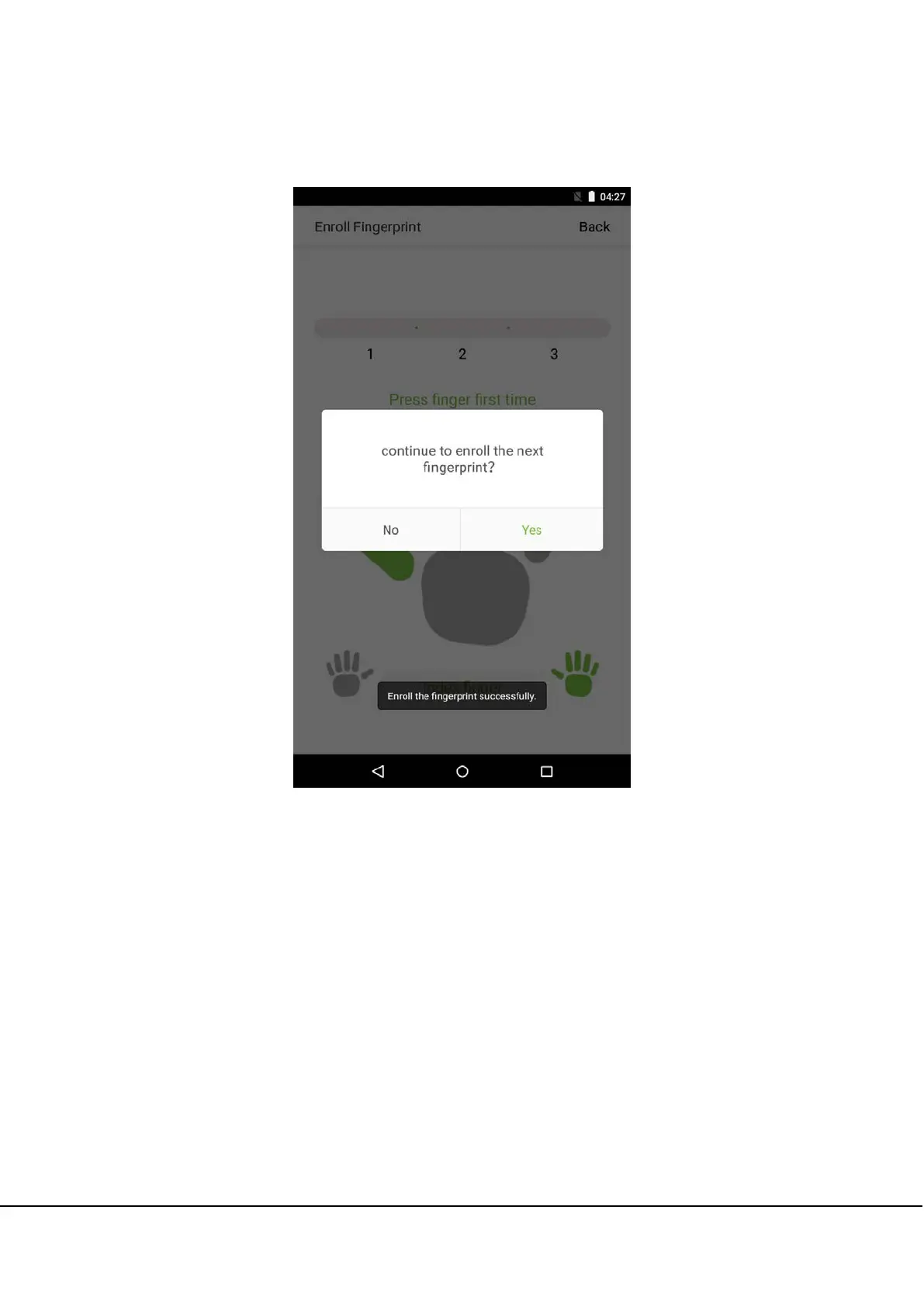 on [Yes] to record the next fingerprint, or [No] to return to the fingerprint registration interface.