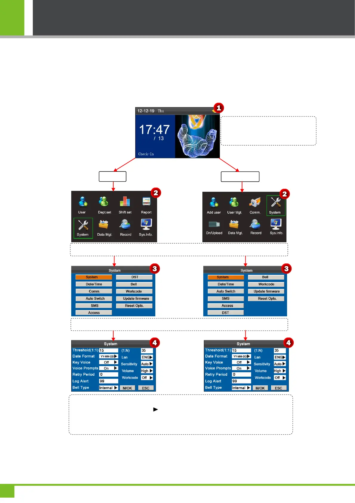 Press ▼ key to select System and press [M/OK] key to enter the System interface.