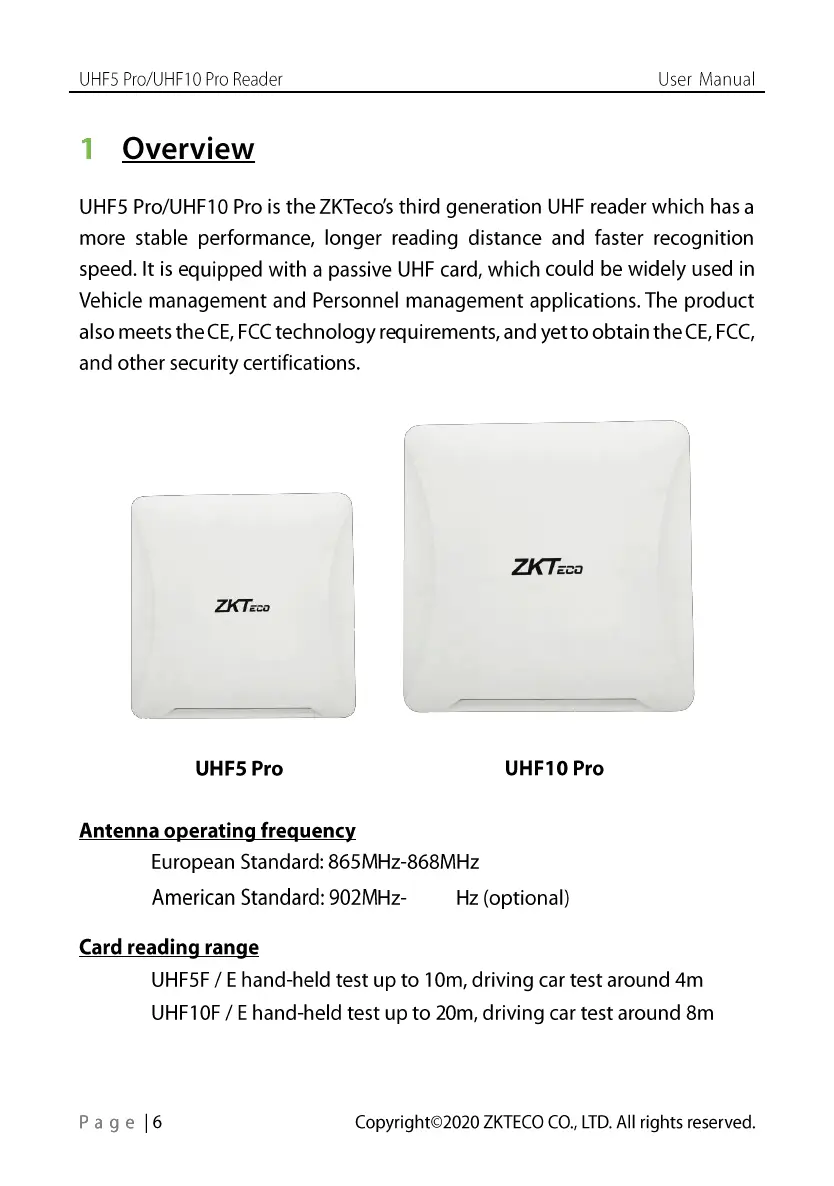 ZKTeco UHF5 Pro - Overview; Antenna Operating Frequency; Card Reading Range