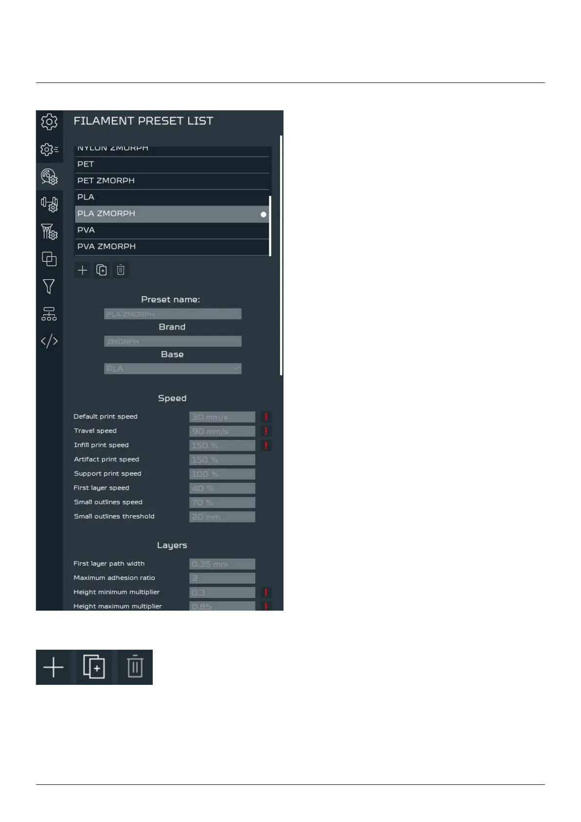 To add a new preset, duplicate or delete existing presets click on the buttons