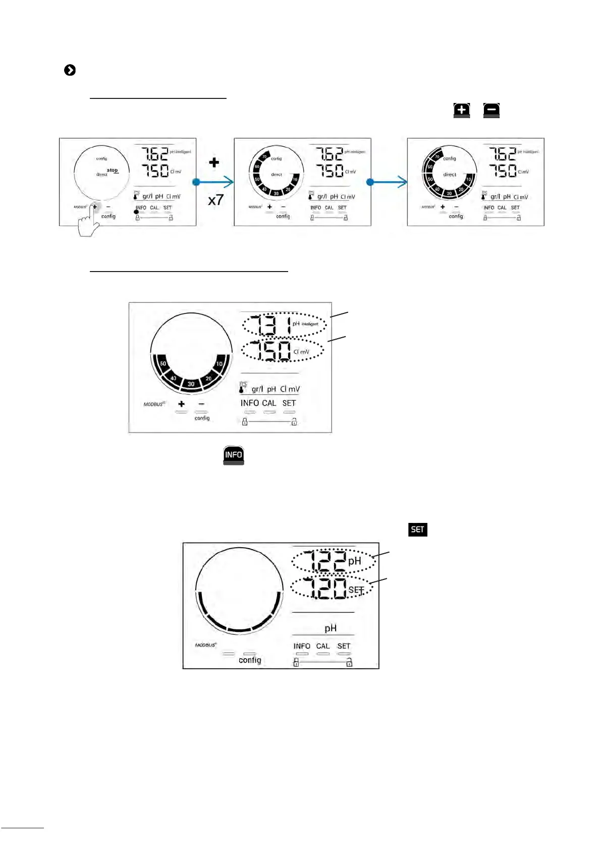 - Three mes to access the pH value and setpoint,