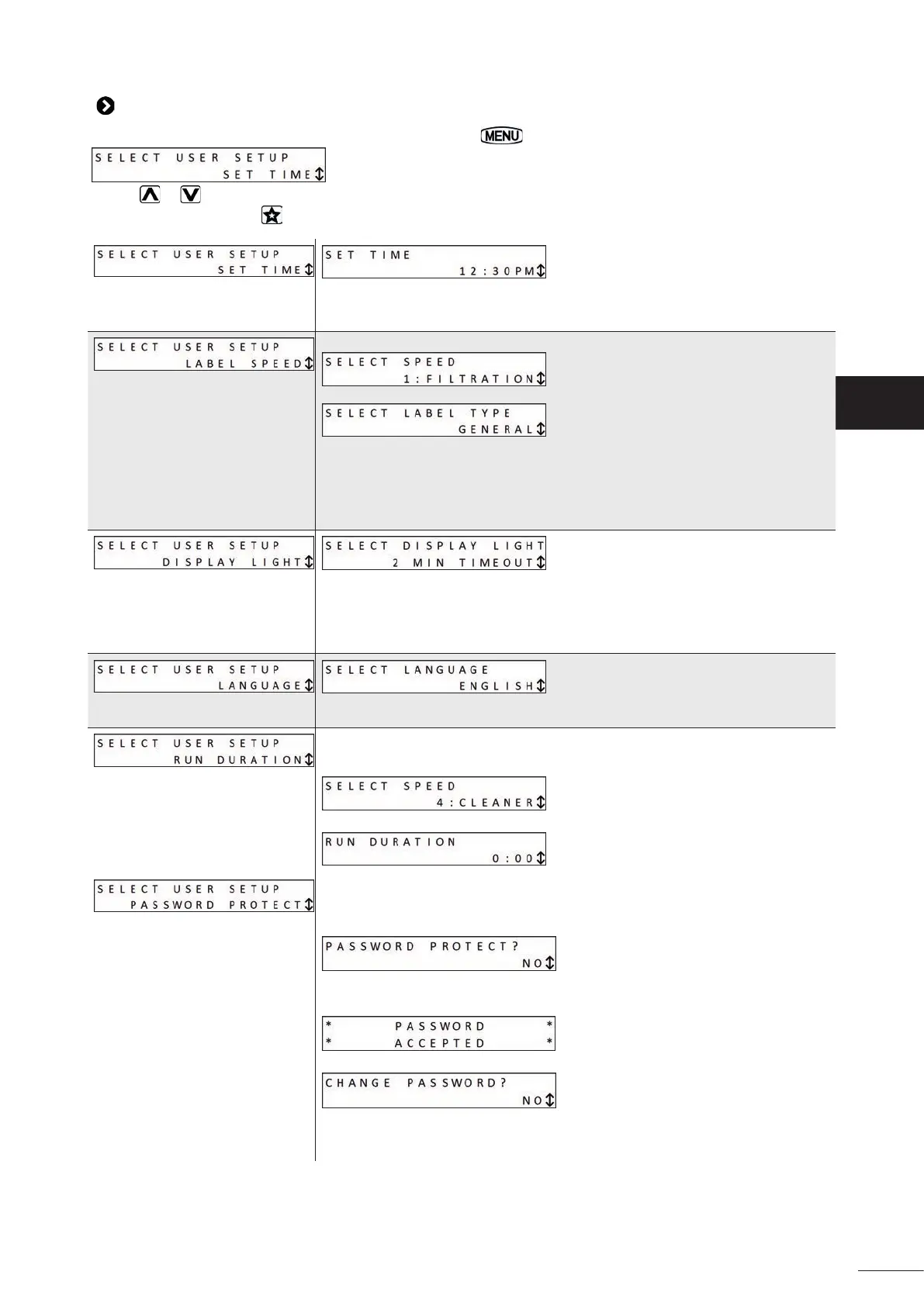 To access the user menu when the pump is off , press and hold for 5 seconds: