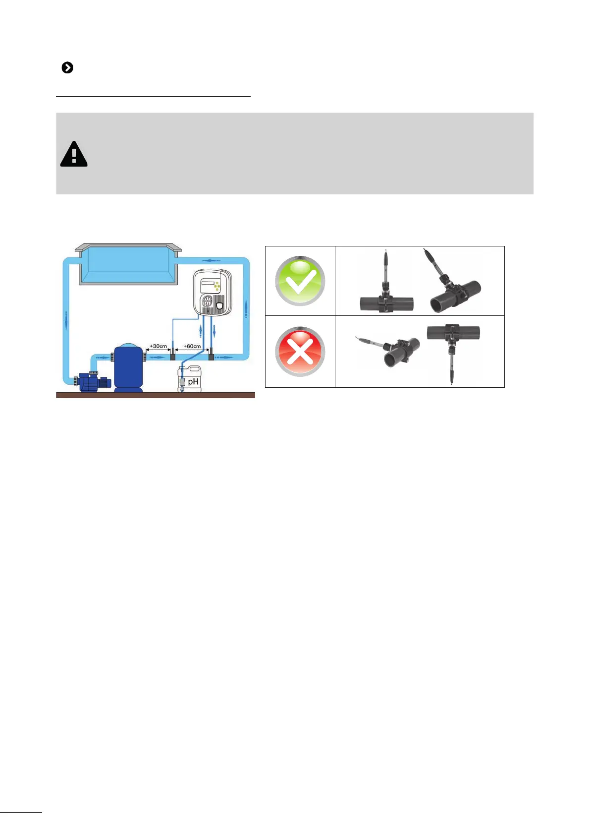 • The pH sensor must be installed more than 30 cm before or a� er a piping bend. Use the op onal