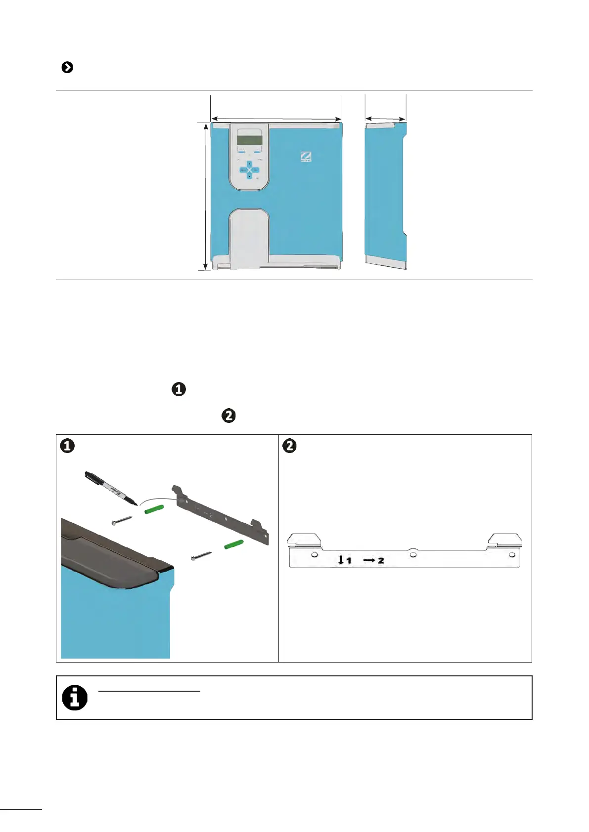 - Fix the control box to the metal support by moving 1 (downwards) and 2 (rightwards) in order to lock the