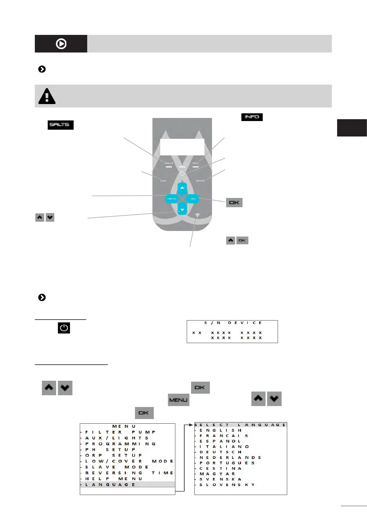 • On rst start-up, the list of available languages is displayed; simply select the desired language using the
