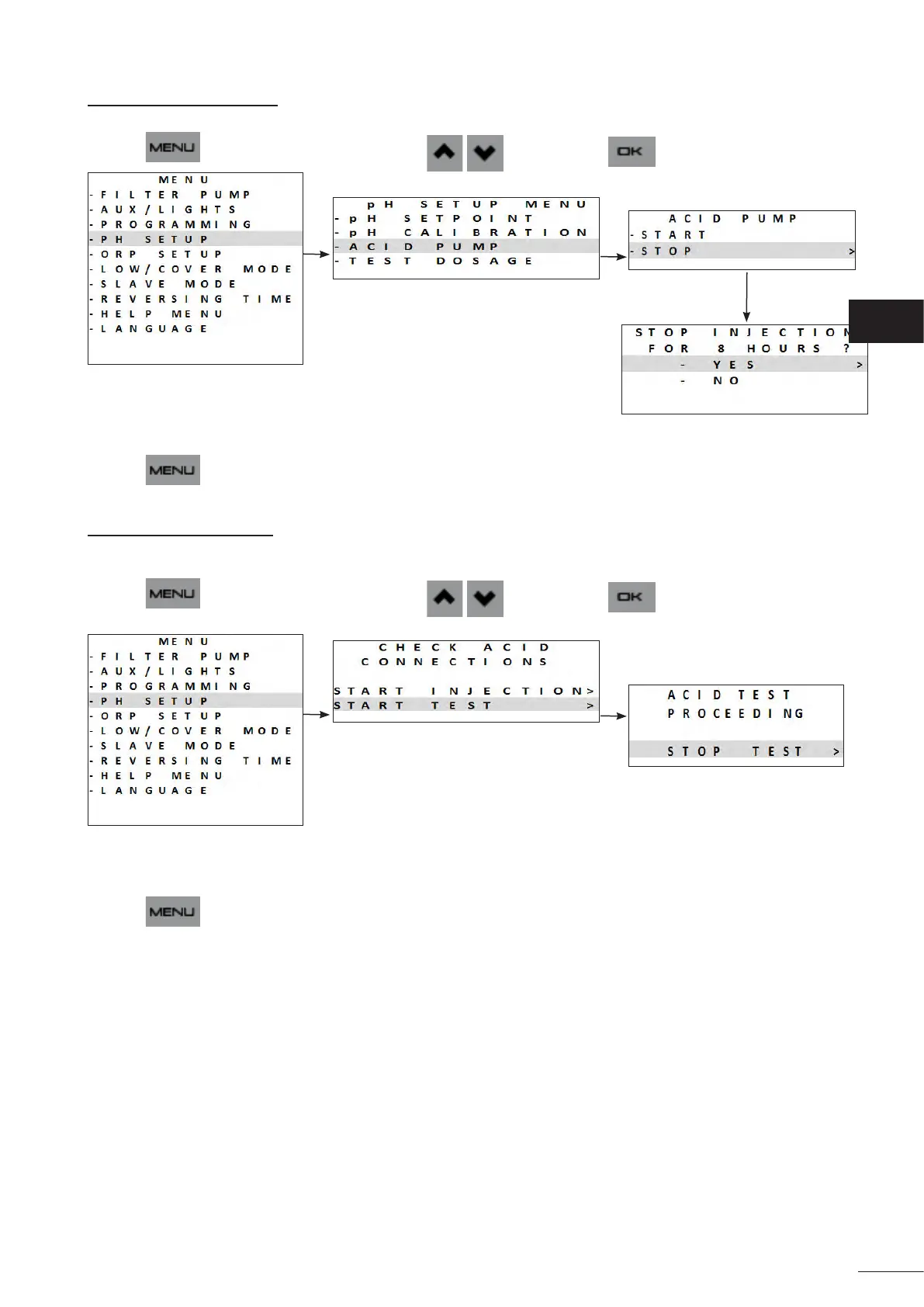 To prevent acid from being injected when not needed: The pH dispenser pump can also be stopped for 8 hours.