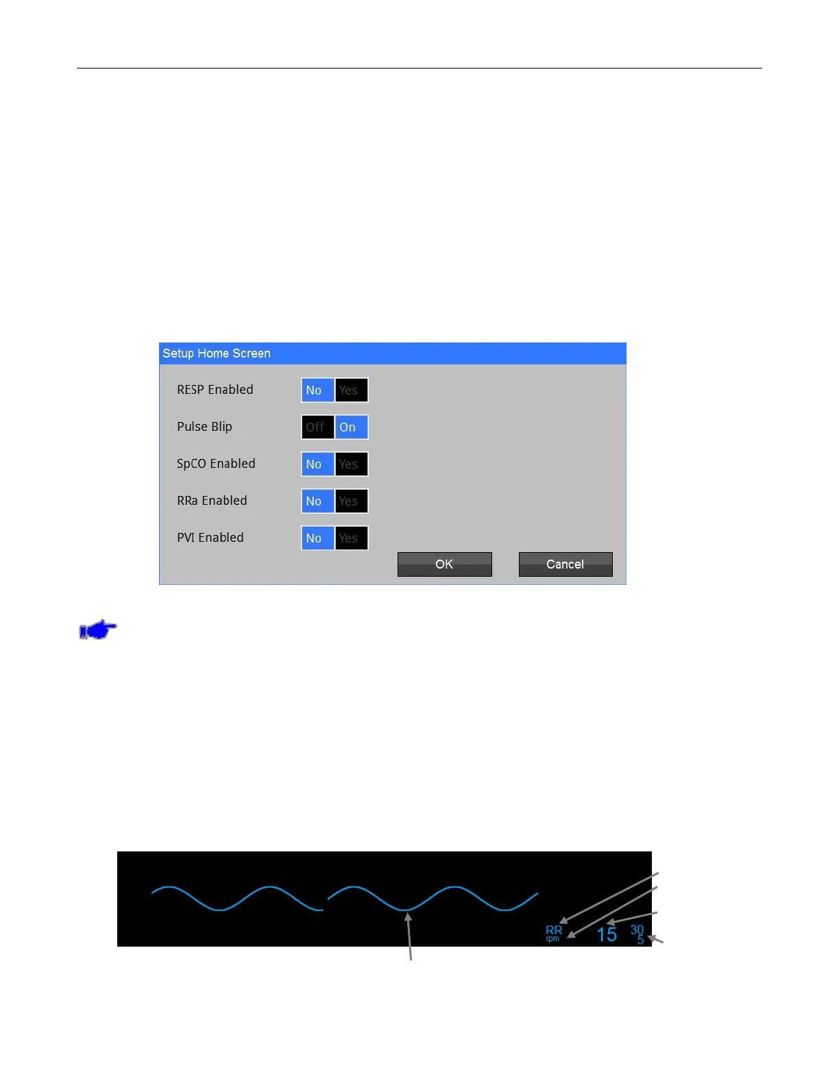 oscillating Respiration signal on the Monitor display. This may take up to 30 seconds after the