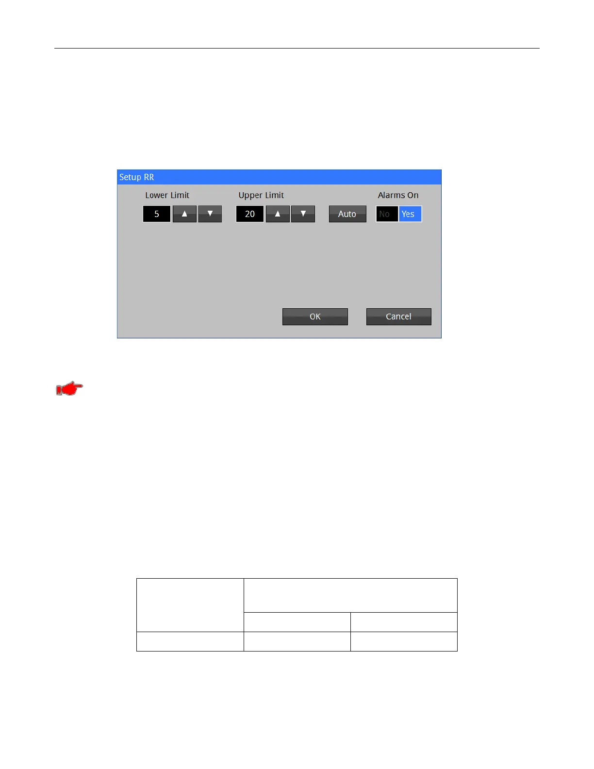 The Upper and Lower alarm limits for RR can be set automatically using the Auto feature,