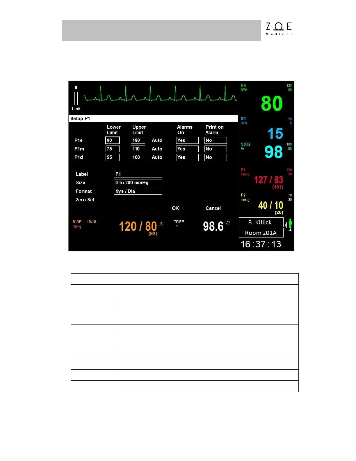 P1 systolic/mean/diastolic alarm upper limits