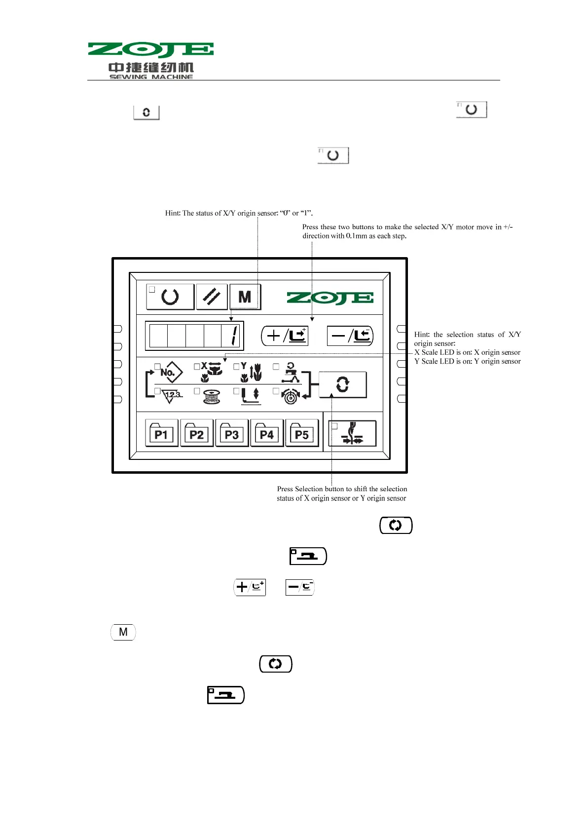 to search the origins of X/Y motors. At that time, the presser goes down and the Sewing LED is on