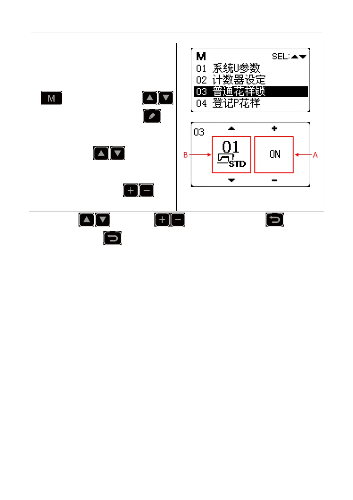 换;右半部份 B 显示的是花样状态,显示为ON