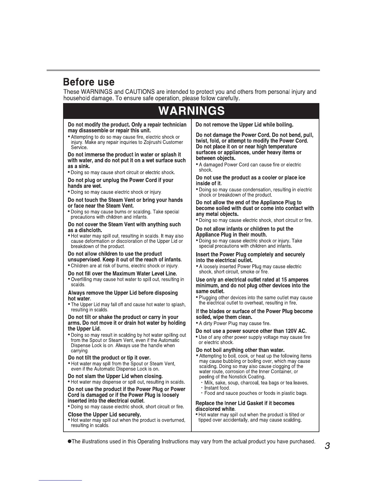 Zojirushi CD-LTC50 - WARNINGS