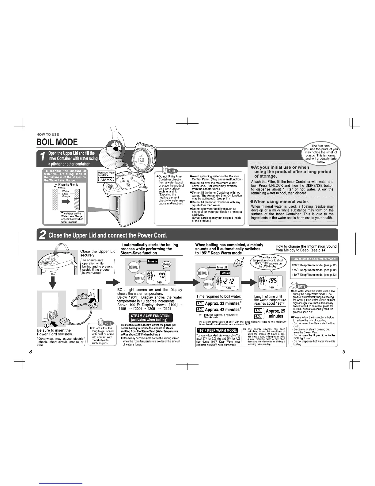 Zojirushi CD-WBC30 - Boil Mode Operation; Filling and Connecting Power; Steam-Save Function Explanation; Information Sound and Keep Warm Setup